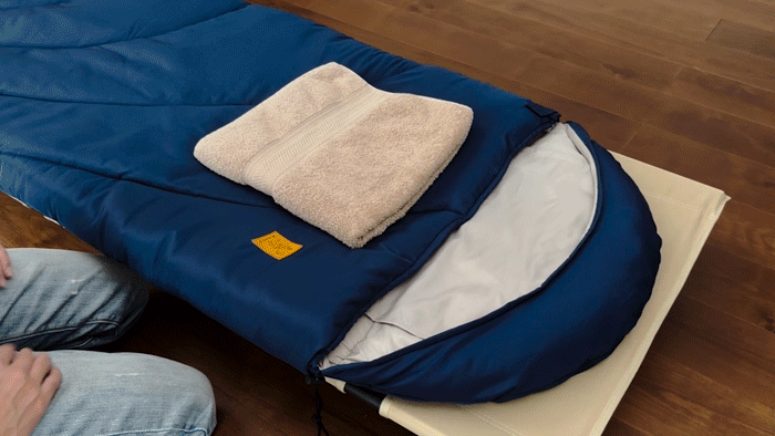 寝袋の上部にブランケットを二つ折りにして取り付けた状態では「冬用寝袋」。ブランケットを分離すると、それぞれ「春秋用寝袋」と「ブランケット」として使えます。